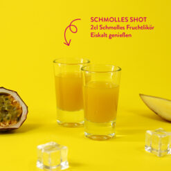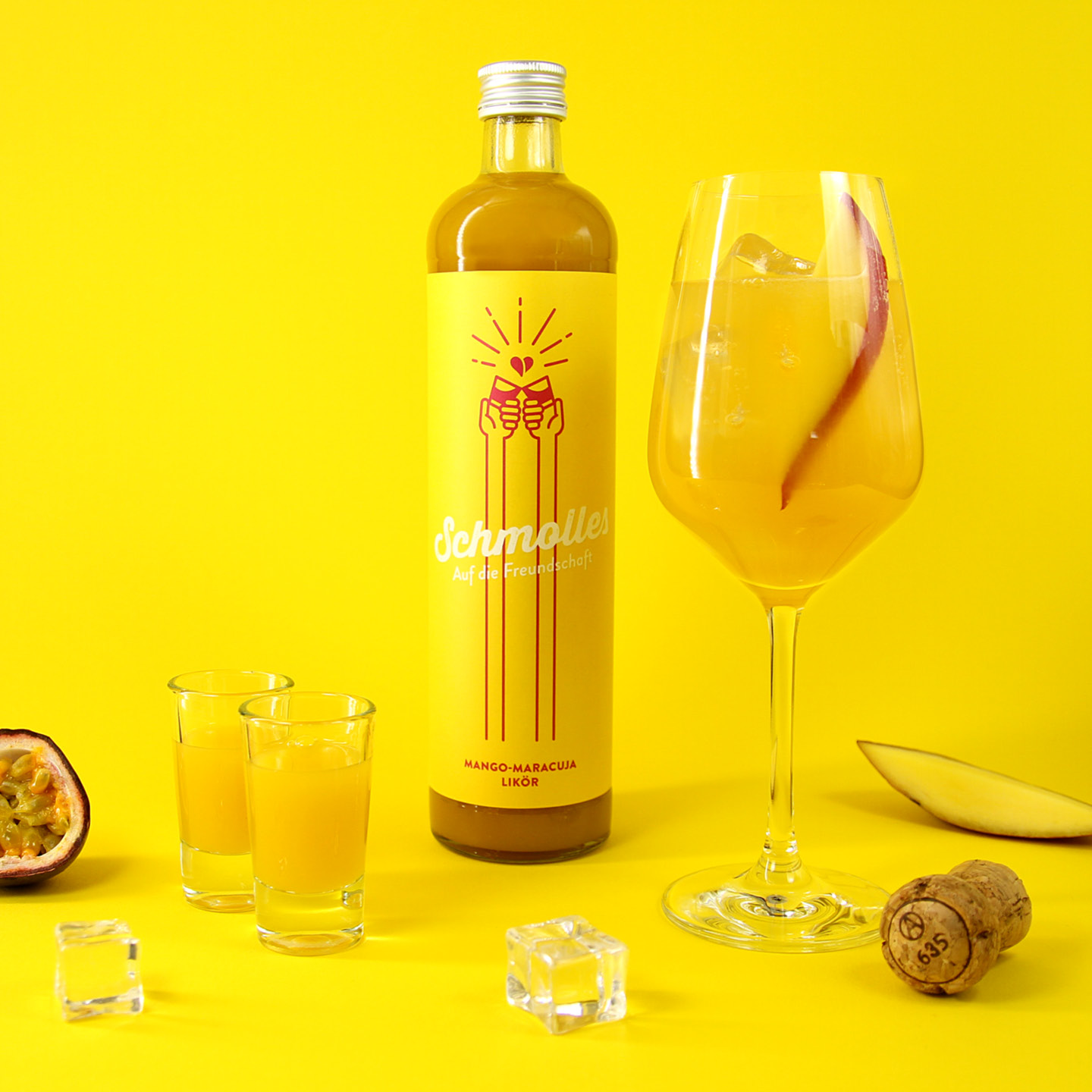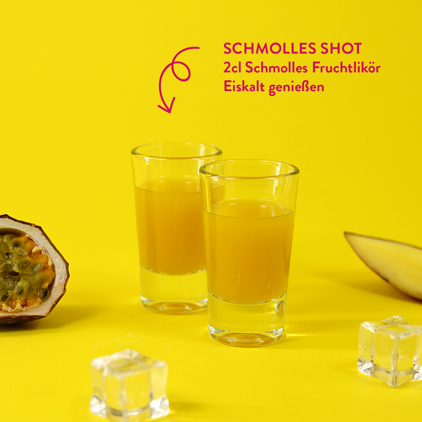 Süß-sauer im Geschmack mit exotischer Mango, Maracuja und dem Anklang unseres HELMUT Rum, Vanille und einer feinen Kokosnote – das ist unser Schmolles Mango-Maracuja Likör.