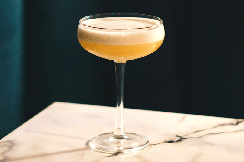 Alle Zutaten auf Eis shaken, danach das Eis abstrainen und kurz ohne Eis shaken – alles auf Eis in ein double Old Fashioned Glas. Dekoriert mit getrockneten Kamillenblütten.